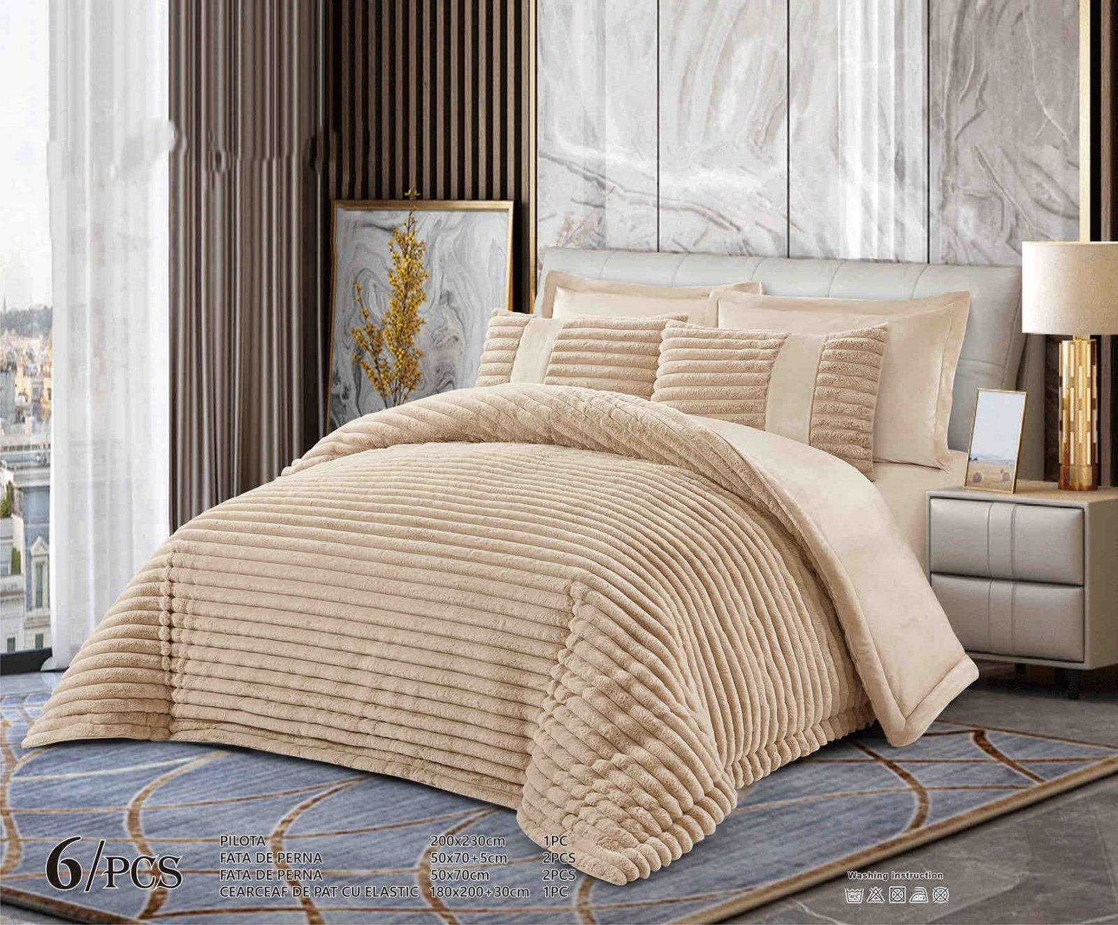 Lenjerie de pat cu Pilota Inclusa , Cearceaf cu Elastic, 6 Piese, Blană de Iepure Artificială - Bej